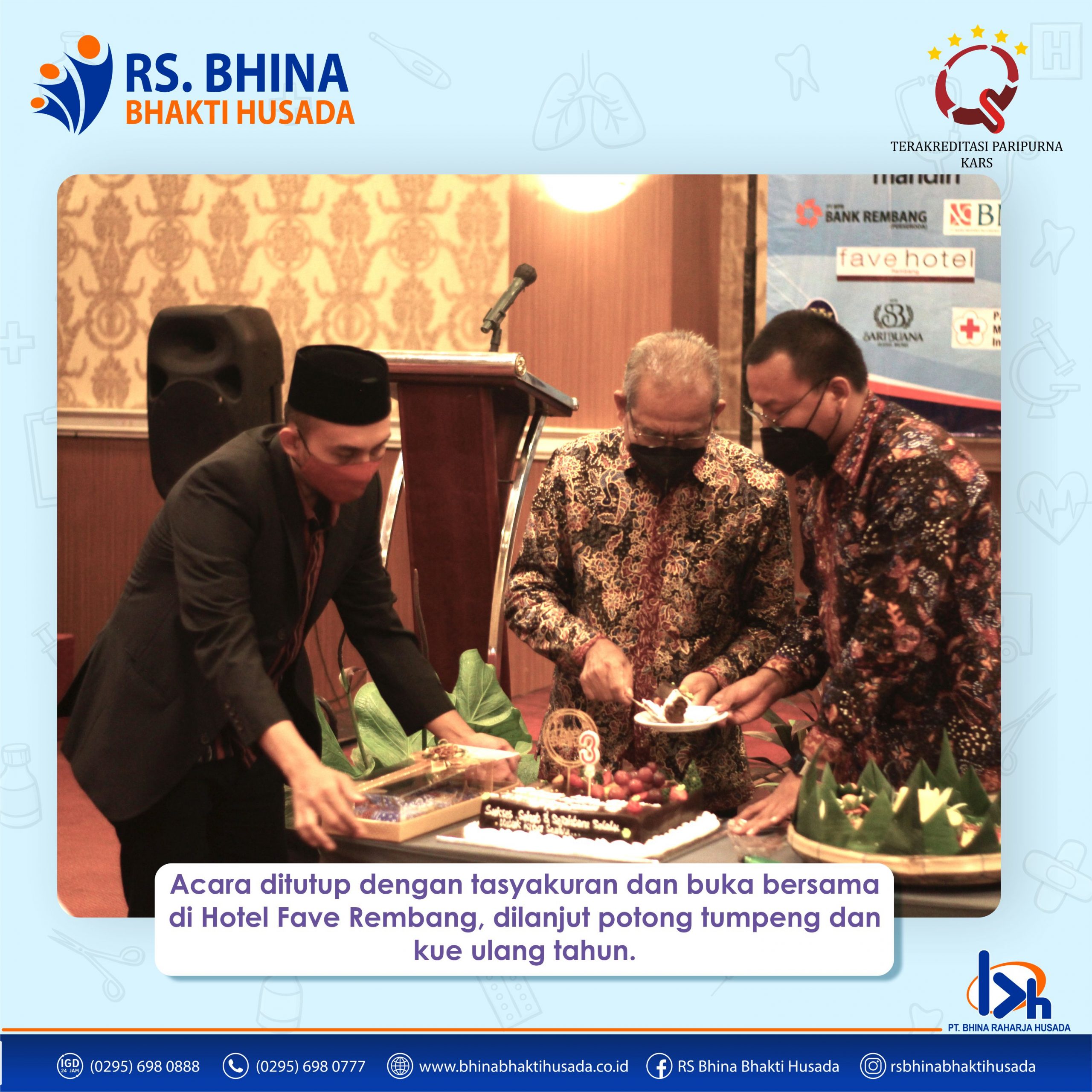 HUT Ke-3 RS. Bhina Bhakti Husada Selasa 11 Mei 2021, RS. Bhina Bhakti Husada Rembang berulang tahun yang ke-3. Rangkaian acara ulang tahun RS. Bhina Bhakti Husada berupa pemeriksaan kesehatan & pembagian sembako gratis, ditambah acara puncak Bancaan (Bangun cinta antar rekanan) Ramadhan di Fave Hotel. Dalam acara tersebut beberapa tamu diundang mulai dari perwakilan …